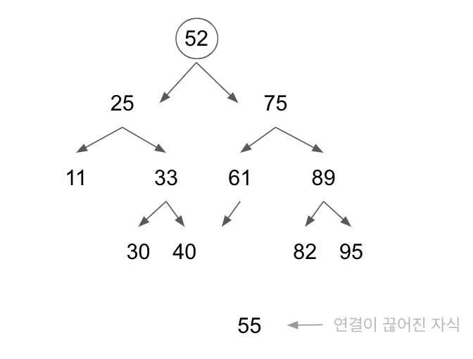 - 삭제할 노드에 자식이 하나면 노드를 삭제하고 그 자식을 삭제된 노드가 있던 위치로 옮긴다.