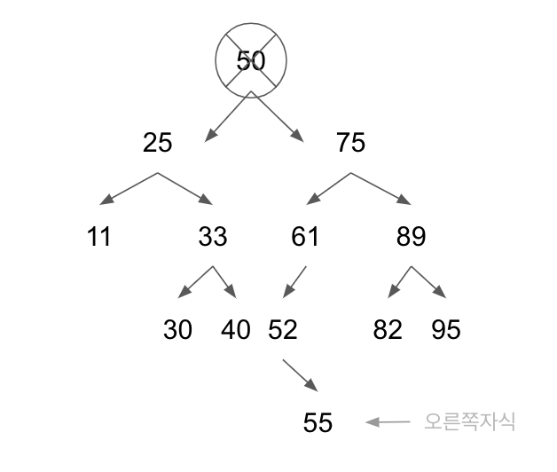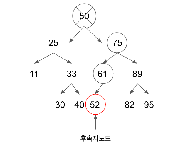 - 만약 후속자 노드에 오른쪽 자식이 있으면 후속자를 삭제된 노드가 있던 자리에 넣은 후, 후속자 노드의 오른쪽 자식을 후속자 노드의 원래 부모의 왼쪽 자식으로 넣는다.