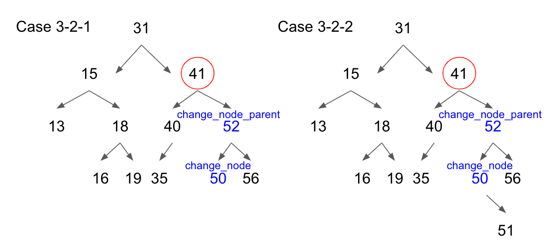 - Case3-2-1 : 삭제할 Node가 parent node의 오른쪽에 있고 삭제할 Node의 오른쪽 자식 중 가장 작은 값을 가진 Node의 child node가 없을때