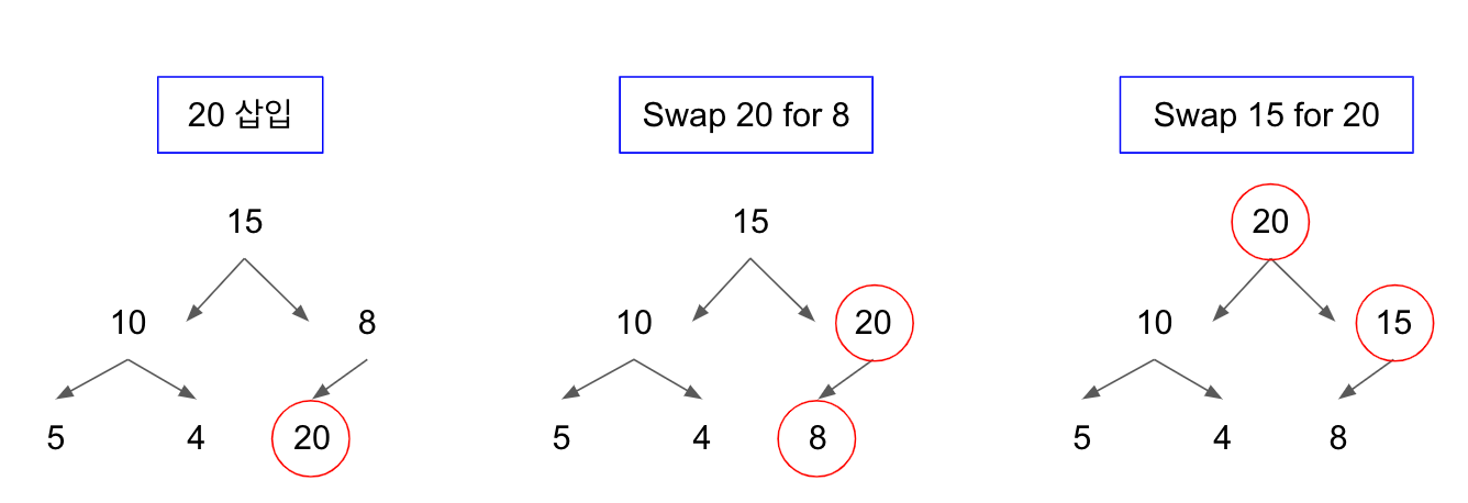 - 채워진 노드 위치에서, 부모 노드보다 값이 클 경우, 부모 노드와 위치를 바꿔주는 작업을 반복함 (swap)
