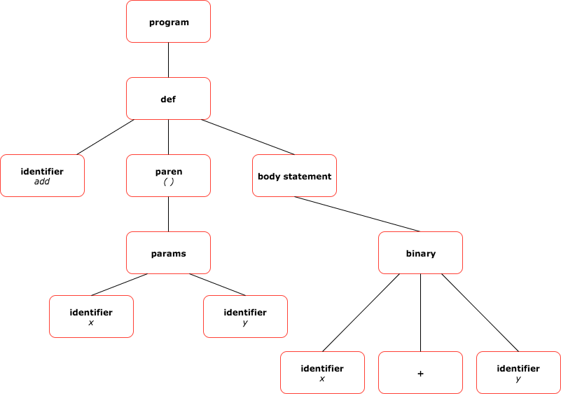 이렇게 트리구조로 나타낼 수 있다. 트리의 각 노드는 프로그램의 구성을 나타낸다. 예를 들어 두 식별자 x, y의 합은 이진 노드로 표현된다. 이 이진 노드는 세 번째 값을 도출하기 위해 두 식별자에 대해 수행되는 작업을 인코딩한다.